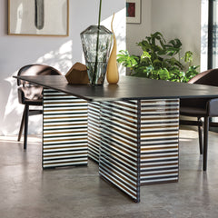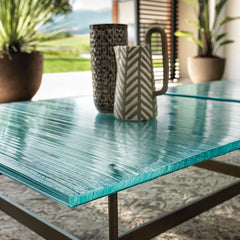 Table with base made of four separate 30 mm DV Glass elements, transparent or with colored stripes. Top made of 15 mm transparent glass, back-lacquered with monochrome color or hand-finished with Ecomalta, finer-grained texture finish.