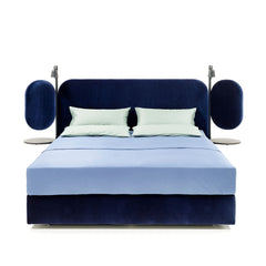 With bolster pillows that run its entire length, the daybed has a bold personality and is super-versatile. Thanks to the array of upholstery options possible, it can fill many needs and fit in different settings – upholstered  in leather, for a minimalist Bauhaus effect, or in mohair velvet for maximum comfort and enveloping softness. The wood seat structure has an open-pore painted finish, with turned legs and achieves its fullest expression once the bolster pillows, one by one, have been set in place, along with the armrest and backrest (available in two sizes), and the round side table with surfaces in concrete or metal, in various colors and finishes for a more textured effect. The daybed is an invitation to relax or wait in comfort. Thanks to its sleek linearity, it can stand alone or be a fitting addition to an arrangement of furniture pieces and accessories, ideal for both domestic use and public spaces.